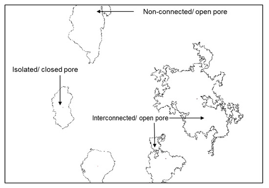 Three types of pores which may influence oil penetration have been identified [34] in fried products: (a) interconnected pores—these are accessible from various points and greatly influence the flow of oil due to the continuous paths formed by the interconnection of the pores, (b) non-connected pores, which are inaccessible and do not influence flow of oil through the food matrix, (c) isolated pores, which are accessible from just one direction and have limited influence on oil flow. Non-connected and inter-connected pores are open, while blind pores are closed pores (Figure 5). These pores were identified in our products.