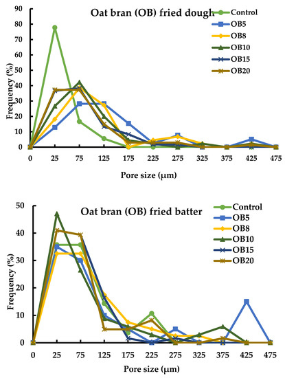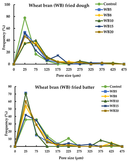 Pore sizes of magwinya obtained from cross-section micrographs were found in a range of 0–475 µm (Figure 6). In fried dough samples, the control pore sizes between 0–25 µm had the highest frequency (80%), while in fried batter samples, control pore sizes of 0–25 µm peaked at 35% and 50% for OB and WB fried batter, respectively. For the rest of the samples at 5%–20% bran addition, pore sizes of 0–175 µm peaked at 52%, 40%, 60% and 47% in WB and OB fried dough, WB and OB fried batter, respectively, then dipped at >125 µm size. Moreno and Bouchon [4] reported a pore size range of 0–85 µm for gluten-based fried matrices. These differences in pore sizes could be accounted for by the following variations: (i) sample weight and size variation—thick products (at least 50 g weight and > 50 mm diameter) in this study and thin products in theirs (4 g weight, 2 mm thickness), (ii) the extent of sample dehydration/moisture loss which contributes to the enlargement and shrinkage of pores. At a final moisture content of 2% in the report of Moreno and Bouchon [4], the associated extreme shrinkage of pores could be explained by maximum moisture loss and total starch gelatinisation, which led to the alteration of gas cell sizes formed during mixing and kneading unit operations.