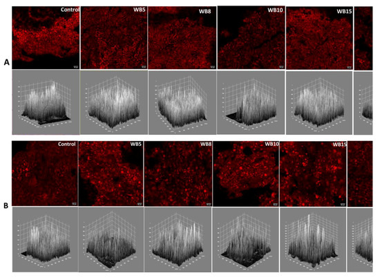 Crust confocal micrographs (top) of wheat bran fried batter (A) and fried dough (B) and their respective grey level intensity plots (bottom). Wheat bran (WB); values between five and 20 represent the concentration of bran in the sample formulation.
