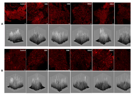 Crust confocal micrographs (top) of oat bran fried batter (A) and fried dough (B) and their respective grey level intensity plots (bottom). Oat bran (OB); values between five and 20 represent the concentration of bran in the sample formulation.