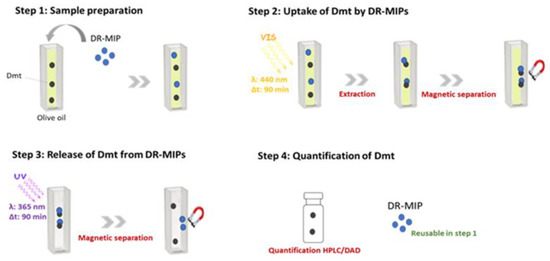 The ultimate goal of this work is the implementation of a sample preparation methodology based on the use of DR-MIP as “smart” sorbent for the selective enrichment of Dmt from olive oil samples and further trace analysis of Dmt levels by means of HPLC/DAD. As depicted in Figure 1, in general, the implemented analytical methodology has some remarkable features, namely, (i) the use of an “intelligent” imprinting system in which the common physical robustness and thermal stability of MIPs are maintained as well as the pre-defined selectivity to the target molecule imparted by the molecular imprinting process; (ii) additional improvements on the straightforward photo-regulated uptake/release of the analyte through photoirradiation using light with appropriate wavelength, which can be manipulated precisely and rapidly; (iii) this is conjugated with magnetic properties, which allows a quick and easy separation, avoiding tedious separation, filtration and centrifugation steps. The methodology has been successfully implemented in organic olive oil samples spiked with concentrations of Dmt similar to the MRL enforced by the legislation, enabling to evaluate the efficiency of the extraction; a recovery rate of 83.5 ± 0.3% was obtained, with LOD and LOQ of 0.029 µg·mL−1 and 0.088 µg·mL−1, respectively.