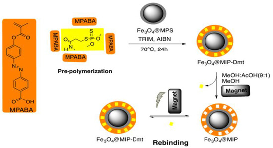 The synthesis of DR-MIP involves a previous preparation of Fe3O4@MPS, which is based on a published procedure [21,22]. In detail, Fe3O4 (1.5 g) and toluene (50 mL) were added to a three-necked flask under nitrogen. After that, nanoparticles were sonicated for 1 h; the obtained solution was mechanically stirred, and MPS (5 mL) was added. The reaction was carried out at 50 °C with vigorous mechanical stirring overnight. Fe3O4@MPS nanoparticles were separated by using a magnet and then were washed with ethanol (2 × 30 mL), dichloromethane (3 × 30 mL) and then dried under vacuum at 40 °C during 5 h. Next, DR-MIP was prepared according to the following procedure. It must be noted that the reaction was carried out in the dark and under nitrogen atmosphere. In a 50 mL round-flask, 155 mg (0.5 mmol, 4 eq) of MPABA, 28.7 mg (0.125 mmol, 1 eq) dimethoate, 25 mL of ACN, 6 mL of DMF and 1 mL of DMSO were added. This mixture was sonicated at 0 °C for 30 min. Fe3O4@MPS (112 mg) and 0.96 mL (3 mmol, 24 eq) of TRIM were added to the mixture and sonicated at 0 °C for 1 h. Then, the mixture was allowed to warm up to room temperature. After 1 h, 100 mg (0.68 mmol, 5.4 eq) AIBN was added. The mixture was mechanically stirred at 70 °C within 24 h. Next, DR-MIP particles were separated from reaction liquid using a magnet. The removal of the template was provided by successively washing with MeOH, a mixture of MeOH:AcOH (9:1 (v/v)) followed by MeOH. Then, DR-MIP particles were dried under vacuum at 50 °C. DR-NIP (non-imprinted polymer) was synthesized using the same procedure but in the absence of the template (Dmt) in order to assess the non-specific binding (Section 2.5 and Section 3.2).