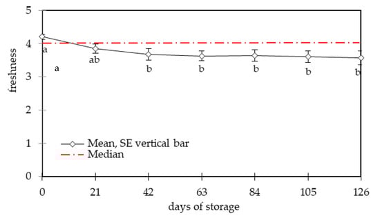 Assessment of the freshness of cured loins stored at 6 °C for 126 days; a, b (continuous line) followed by different letters are significant differences (p < 0.05); bars indicate the standard error for each assessed time. The dashed red line indicates the median values.