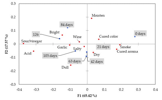 Even though the attributes “sour/vinegar” and “acid” had a frequency of use lower than 20% for most of the storage durations, they had frequencies or 20% or more at the longer durations, and so were kept. The first factor (F1) in Figure 3 is very discriminative of the freshness and spoilage attributes. On the right side of the plot are the variables associated with the fresher sliced cured loins (0 and 21 days of storage). This side of the plot includes the characteristic attributes of cured loins, with the higher factor loadings being smoke and cured aromas. The cured loins with longer storage durations (84, 105, and 126 days) are located in the left side of the plot, and are associated with the spoilage-related attributes “sour/vinegar” and “acid”. Curiously, two of the middle storage durations (42 and 63 days) were projected precisely on the origin of the F1, indicating a clear correlation between loss of smoke and cured aromas and accrued sour/vinegar aroma and acid taste. These four attributes were the only ones with significative differences (p < 0.05) between storage durations (Table 2). Still, for sour/vinegar aroma and acid taste it was not possible to locate differences between durations, probably because the significance level was close to the 0.05 limit and there was a reduced number of checks for those attributes. “Cured color” also suffered a reduction in frequency of checks by the participants, but it was not significant (p = 0.097).