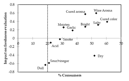 In Figure 4 the impact that each characteristic had on the freshness evaluation in the five-point scale is plotted. As previously pointed out, a sour/vinegar aroma and acid taste were the two main sensory traits associated with the spoilage process. These attributes were noted by 21% and 22% of participants, respectively, for the longest storage duration (126 days) [76]. The major penalties in the freshness evaluation were determined by the presence of a sour/vinegar aroma, with a −0.59 penalty in the five-point scale, although this was noted by only about a fifth of the participants. The “dull” aspect, which was also associated with a loss of freshness (Figure 3), had a slightly higher penalty of −0.63, but the number of participants noting this was below 20%. The acid taste was noted by 22% of participants, but the impact in the freshness evaluation was only −0.10. Forty-two percent of participants noted the “dry” aspect, but its effect on the freshness evaluation was less than 0.42 points. On the positive side of the mean impact figure, the characteristic cured attributes color and aroma, as well as the aromatic notes associated with the seasoning of the cured loins (wine and garlic), had the highest positive impact on the freshness evaluation. While the smoke aroma was an attribute associated with fresher samples (Figure 3), it had a neutral impact on the freshness evaluation (Figure 4). The aspect attributes “bright”-“dull” and “moisten”-“dry” had higher impacts on the negative side than on the positive.