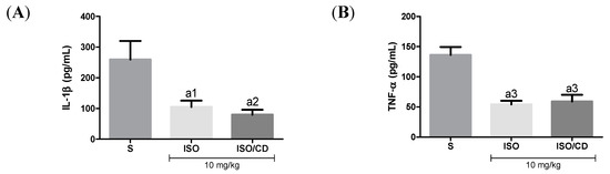 Effect of ISO e ISO/β-CD (10 mg/kg/v.o.) on the inflammatory cytokines IL-1β (A) and TNF-α (B) in the pleural lavage of the animals submitted to the carrageenan-induced pleurisy. (S: control/saline). Data expressed as mean ± SEM of 6 animals. Statistical analysis: One-way ANOVA followed by Tukey’s test with multiple comparisons. (a1 p < 0.05; a2 p < 0.01; a3 p < 0.001; a4 p < 0.0001 vs. saline).