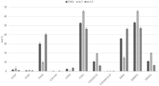 Both enzymatic and chemical procedures were developed for elucidating the FA distribution on the glycerol backbone of complex lipids [64,65,66]: the term “regiospecific” refers to analytical procedures aimed to study the FAs esterified in the sn-2 position separately from those esterified to the primary hydroxy groups of glycerol; the term “stereospecific” refers to procedures that are able to determine the FA profiles esterified to each of the three positions of the glycerol backbone. Experimental data revealed a preferential esterification of SFAs (palmitic and stearic) in the sn-1,3 positions (mol% of FA in sn-1,3 higher than in TAGs), while unsaturated fatty acids (oleic and linoleic) are mainly acylated in position sn-2 (mol % of FA in sn-2 higher than in TAGs) (Figure 1). The asymmetric structure of HPO TAGs suggests that the chain length and the unsaturation degree of FAs could be the discriminating factors in the selectivity of the acylating enzymes [6,55]. It seems that interspecific crossbreeding does not affect the TAG structure, because of the closeness of the FA regiodistribution in TAGs of HPO and oils of its African parent [6].