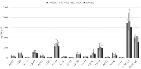 Diacylglycerol (DAG) contents (mg/100 g; mean ± SD; n = 3) in crude O × G hybrid palm oil during fruit ripening (data from [30]). P = C16:0; S = C18:0; O = C18:1; L = C18:2. WAA = week after anthesis.