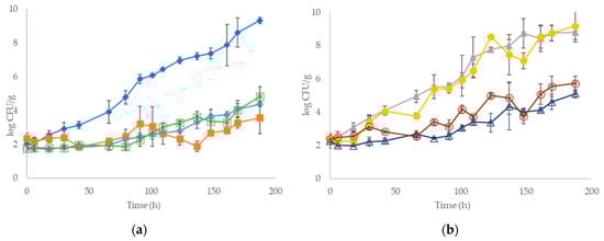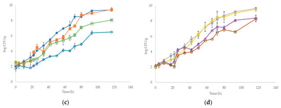In contrast for meat inoculated with LAB strains, sensory rejection was reported by the panel after 124.5 and 140 h for mono and dual LAB cultures, respectively, indicating that spoilage from LAB is milder and mostly characterized by muscle souring [10,26]. At 10 °C, the time needed for sample rejection was reduced compared to 4 °C, while the population of the microorganisms was higher (Table S2).