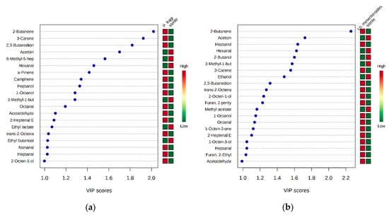 Fifty-one (51) volatile compounds were detected during the storage of pork fillets at both temperatures. The majority of them consisted of alcohols, aldehydes, ketones, esters, terpenoids and sulfur compounds. Table S3 presents the 51 volatile compounds detected for all meat cases (sterile and inoculated). Accordingly, the 51 volatile compounds were selected and used for quantitative estimation and discrimination of the meat samples based on the different inocula employed, as well as in sensory classification. Many of the selected compounds, such as 1-octen-3-ol, diacetyl, acetoin, 2-butanone and ethyl acetate, have already been identified to be involved in meat spoilage [4,12,20,27,28]. The selected data were uploaded to the online platform MetaboAnalyst v3.0 (www.metaboanalyst.ca). Significant differences between the sterile meat and each case of monocultures of inoculated meat were observed. Compounds with significant effects (p < 0.05) during aerobic storage after t-test analysis were found to be 2-butanone, acetoin, diacetyl, hexanal, 6-methyl-5-hepten-2-one, 3-methyl-1-butanol, heptanol, 2-butanol, ethanol and 3-carene (data not shown). Subsequently, PLS-DA was applied in order to extract the important features (volatile compounds) for each case of monocultures and dual cultures in relation to the sterile meat. PLS-DA analysis has some advantages, like discriminating samples between known classes and/or predicting unknown samples, but also, it can associate metabolite data with each class [29]. Regarding the results obtained from the treatment of sterile meat versus inoculated meat with P. fragi, it was shown that most of the compounds were highly correlated with the inoculated meat (Figure 2a).