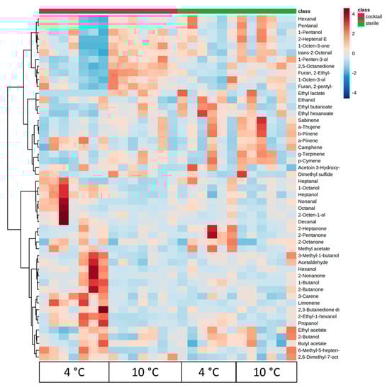 Hierarchical clustering result shown as a heatmap of volatiles associated with the group of sterile meat (green) and meat inoculated with the cocktail of all cultures (red) during storage at 4 and 10 °C. Ward-linkage clustering was based on the Euclidean correlation coefficients of the 51 volatiles identified in the different meat samples. The color scale represents the scaled abundance of each variable, with red indicating high abundance and blue indicating low abundance.
