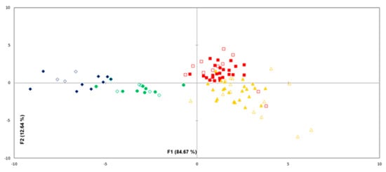 Additionally, discriminant function analysis (DFA) was applied using the XLStat software ver. 2006.06 (Addinsoft, Paris, France), a built-in statistical software package of Excel. DFA is a supervised classification method, in which the decision boundary between different classes is calculated so that the variance between the classes is maximized and the variance within the individual classes is minimized [24]. DFA was used to explore the relationship between variables (volatile compounds) and sterile and inoculated pork samples during storage and discriminate the meat samples in the predefined classes. Data were randomly diversified into train (65 samples) and test data (36 samples). The classification accuracy was determined by the number of classified samples in each class divided by the total number of samples in the class.