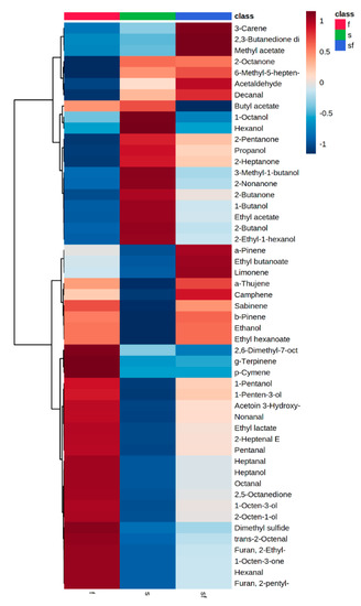 In the case of discrimination between the sensory classes, the selected data (51 volatile compounds) were uploaded to the online platform MetaboAnalyst v3.0 (www.metaboanalyst.ca). From one-way ANOVA, 20 compounds were found significant (p < 0.05) during aerobic storage (data not shown). The differences in the volatile compounds between the sensory classes of aerobically stored meat are clearly distinct in the clustering result shown as a heatmap (Figure 5).