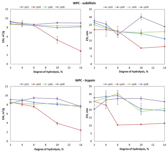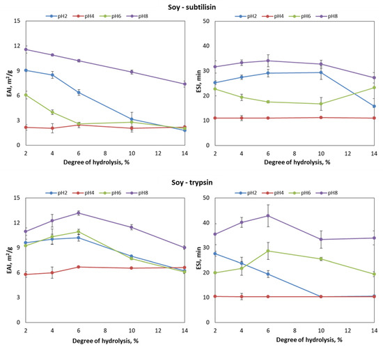 | Optimal combined properties (EAI + ESI) | Soy | Trypsin | 8 | 6.5 | 12.2 | 38.3 |