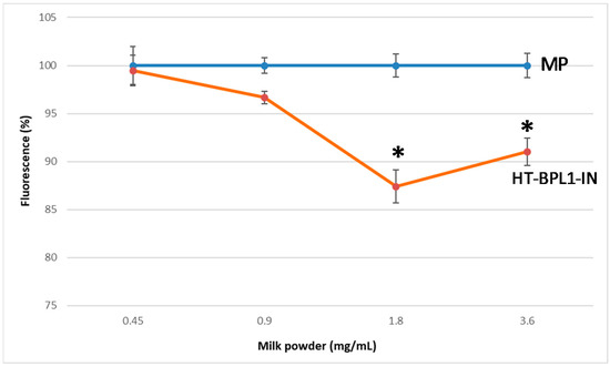 Milk powder supplemented with heat-treated BPL1 (HT-BPL1-IN), reduced fat deposition in C. elegans measured as fluorescence with red Nile, in a concentration-dependent manner. Worms were incubated for 3 days with increasing concentrations (abscissa) of milk powder alone (MP) or milk powder supplemented with HT-BPL1-IN. Data are means ± SD of 120 worms assayed in a prototype experiment. * p < 0.001 with respect control.