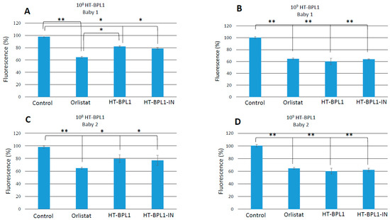 Effects of heat treated BPL1 (HT-BPL1) alone, or added on the infant milk formula Innova (HT-BPL1-IN), on fat deposition of C. elegans grown for 3 days on the fermented slurries (24 h) from two different healthy babies. Fat deposition was monitored with relative fluorescence (ordinates) at the end of the incubation periods, expressed as % reduction of fluorescence compare to control worms (worms grown on DMSO). Antiobesity drug Orlistat was added to a well at 6 µg/mL as positive control (DMSO, the solvent for Orlistat). (A,C) experiments done with 108 HT-BPL1 cells/reactor in slurries from babies 1 (A) and 2 (C). (B,D), experiments done with 109 HT-BPL1/reactor with innova milk formula (HT-BPL1-IN) or HT-BPL1 alone, in fermented slurries from baby 1 (B) or baby 2 (D). Data are mean ± SD of 120 worms per well in each condition * p < 0.05, with respect to control. ** p < 0.001, with respect to control.