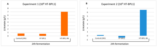 Table 1 summarizes the results obtained. Figure S1 shows representative chromatograms obtained in assays 1 and 2. Note that neither propionic acid nor butyric acid underwent significant changes with respect to control (0 h), both in assay 1 and assay 2. Neither, slurries incubated with HT-BPL1 alone for 24 h, experimented any change with respect to control, both in the case of acetic acid or lactic acid. However, when fermentation was done in the presence of HT-BPL1-IN, acetic acid augmented over 3-fold compared to 0 h samples (9.89 ± 0.02; p < 0.001). The same occurred with lactic acid that rose from near undetectable levels at 0 h (0.08 ± 0.11 g/L) to 8.34 ± 0.20 g/L (p < 0.001). In assay 2 these differences were maintained even though in this assay acetate and lactate baseline levels were higher in the control samples (Table 1). In Figure 3, the net increases of acetate in fermented fecal slurries, are plotted.