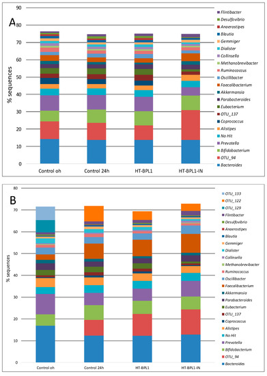 Percentage of identified microorganisms by 16s rRNA by Illumina V3-V4 sequencing. (A) experiments run with two different baby slurries in the presence of 108 HT-BPL1 cells; (B) experiments run with two different baby slurries in the presence of 109 HT-BPL1 cells.