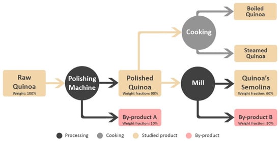 To estimate the absolute amount of lost nutrients per processing phase and with each byproduct generated, weight fractioning was obtained from the processing company. A quantity of 100 g of whole quinoa produces on average 90 g of polished grains and 10 g of by-product A, a by-product containing most of the whole grain’s saponins. Then, the 90 g of the produced polished grains gives 60 g of semolina and 30 g of by-product B (Figure 1).
