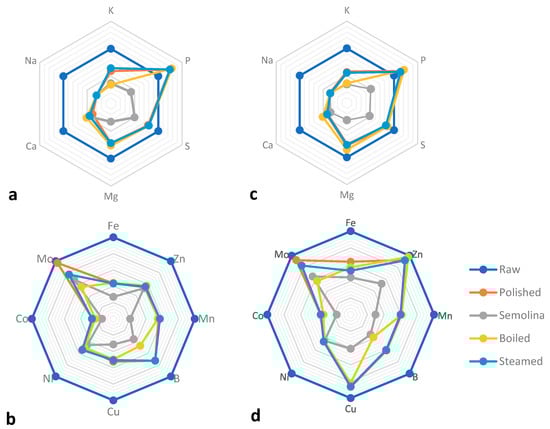 Comparing unprocessed, polished, and milled grains, the results showed that all the minerals were significantly different between the three forms of the grain, except for Mo, Ni and Na. In fact, Mo remained stable between all three quinoa forms, while Ni and Na levels remained the same between polished grains and semolina (Table 1). For macro-elements, and for both varieties, the polished grains maintained approximately 75%, 60%, 40%, and 30% of whole grains Mg, K, Ca, and Na respectively. While the content of P increased by 20% and S decreased by the same level (Table 1, Figure 3).