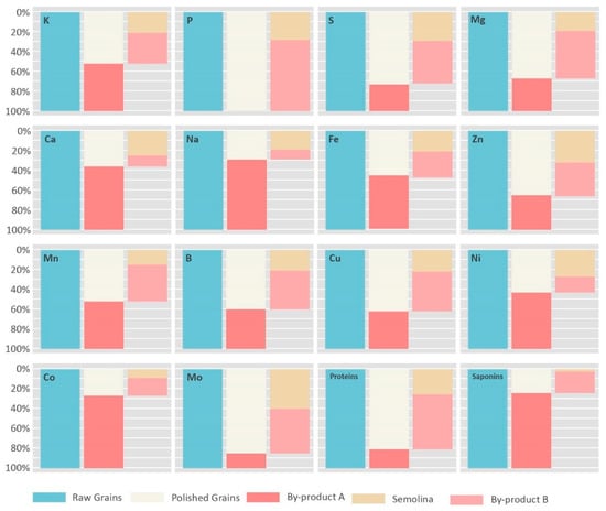 Figure 4 presents the relative proportion of minerals and protein content in each fraction. For minerals in the polishing phase, apart from P, and Mo all the elements fractions lost with byproduct A were superior to its weight fraction (10% of the raw seeds total weight), explaining the loss in concentration of most elements in the polished grains (Table 1). By abundance, Co, Na, Ca, Ni and Fe were the most affected elements with over 50% of their initial quantity lost with byproduct A. In addition, Mn, K, B, Cu, Zn, and Mg presented high erosion levels ranging between 48% and 33%. This suggests a high concentration of these elements in the outer layers of the grain. These results agree with the element mapping through EDX of Mg, P, K, Ca, and S done by Konishi et al., (2004), where he found that Ca mostly exists in the pericarp, and that K, and Mg exists with a high concentration in the pericarp and embryo. In addition, he showed that P exists with a large concentration in the embryo and is absent in the pericarp, explaining the absence of P in by-product A [37].