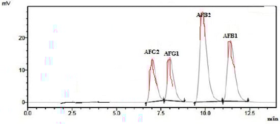 The validity of quantification methods was assured according to the Commission Regulation (EC) No 401/2006 [26] by using certified reference material (CRM) and spiked samples. The validity of quantification methods was assured by using certified reference material (CRM) standards, which are needed for preparing a mixed stock solution in accordance with the EC 401/2006 document of the European Commission [14]. In detail, used CRM were: aflatoxins nos. A 6636, A 9887, A 0138, and A 0263 for AFB1, AFB2, AFG1, and AFG2, respectively (Sigma Aldrich, St. Louis, MO, USA). Adequate stock standard solutions of each of the four aflatoxins at 10 μg/mL were prepared in acetonitrile according to revised AOAC Method 971.22 [27].