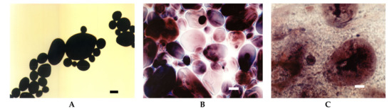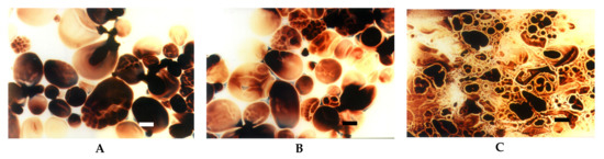 LM micrographs (20x) of acetylated starch of potato origin with different degrees of substitution incubated at the temperature of 60 °C: (A) DS = 0.008, (B) DS = 0.018, (C) DS = 0.123 (Bar-20 µm).