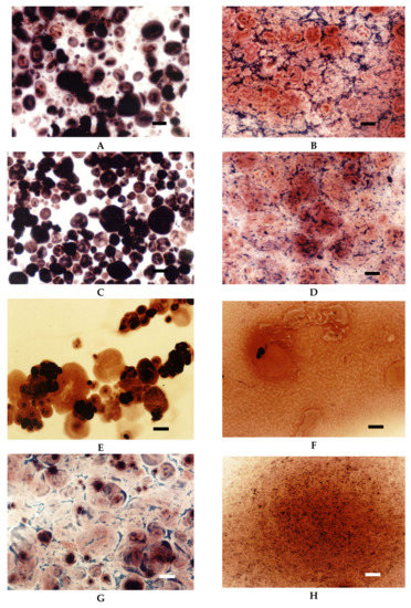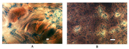Starch modified by the etherification reaction are primarily hydroxypropylstarch used both in food production and other industries as well as cationic starches designed for paper sizing. Hydroxypropylation results in a significant decrease in pasting temperature, time to attain peak viscosity accompanied by increased solubility, and paste clarity. Moreover, hydroxypropylated starches reveal excellent freeze-thaw stability as well as reduced retrogradation tendency which is important in food applications. SEM studies proved that hydroxypropylation results in deep changes in the morphology of starch granules, including the main alteration – formation of deep grooves in the central core region. The extent of these changes depends on the amount of the hydroxypropyl groups incorporated into starch macromolecules [32,37,38]. The effect of the degree of substitution on the morphology of starch granules is observed also in the case of cationic starches. A distinguishing feature of cationic starches is the presence of positively charged quaternary ammonium groups in the structure of starch macromolecules. Due to strong electrostatic interactions between cationic starch and cellulose fibres, it is an excellent preparation for improving the quality of paper, mainly its mechanical properties [22,39]. Cationic starches with a degree of substitution up to DS = 0.04 can be manufactured in water suspension. That type of starches does not show changes in the morphology of granules or crystal structure, but its pasting temperature is lower and the time to attain peak viscosity is shorter. Moreover, starches that reveal medium type of pasting characteristics in their native form (corn, wheat, pea), change it into high type as a result of cationisation. The presence of cationic groups also causes conformational changes in starch macromolecules. Electrostatic repulsion increases the volume of a starch coil in solution, which is manifested by shorter retention times during size exclusion chromatography “SEC” analysis in comparison to native starch [22]. The LM micrographs of cationic starch with DS = 0.04 were similar to those of oxidised starch (Figure 12A,B). Compared to native starch, facilitation of the pasting process as well as different mode of iodine complexation were observed.