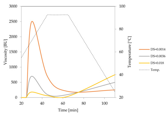 Oxidation of starch can be performed with different agents, such as hydrogen peroxide, ozone or sodium periodate. Nonetheless, the process that employs sodium hypochlorite is of the greatest practical importance. Hypochlorite modified starches were initially used primarily as sizing agents [28]. Nevertheless, they are currently widely used as texture-forming ingredients in the food industry. According to Codex Alimentarius, the degree of substitution of hypochlorite modified starches for food application should not exceed 0.05 [29]. Actually, most modified starches offered on the market have a degree of substitution well below this limit, and some of them meet the requirements of bleached starches. The oxidation reaction is performed in suspension which enables accurate removal of unreacted substrates and by-products. SEM studies proved that it does not cause significant changes in the morphology of starch granules [28]. However, hypochlorite processing is accompanied by a significant reduction in viscosity. The decrease in viscosity is so deep that it was necessary to study the course of pasting at higher concentrations compared to native starches (Figure 5). With the increase of the degree of oxidation, an increase in the final viscosity of the pastes accompanied by a decrease in the peak viscosity was observed. This is a result of the increasing content of carboxyl groups which promote the disintegration of granules during heating. During cooling, however, these groups drive the association of starch macromolecules and gel formation. For this reason, oxidised starches reveal gelling properties that make them highly popular in food production.