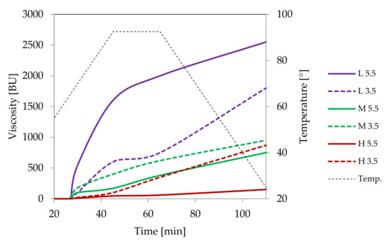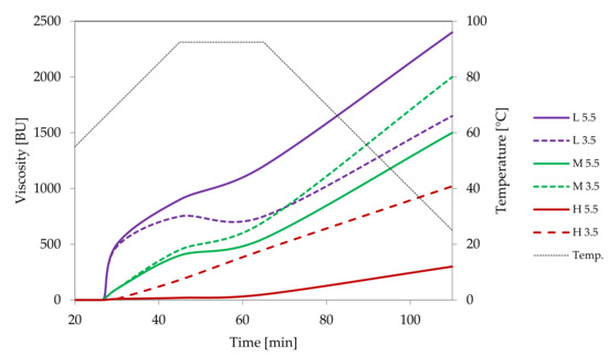 Pasting characteristics of samples of distarch phosphate of potato origin with different degrees of crosslinking (L–low, M–medium, H-high) recorded for dispersions in a concentration of 4.5% at pH = 5.5 or pH = 3.5.