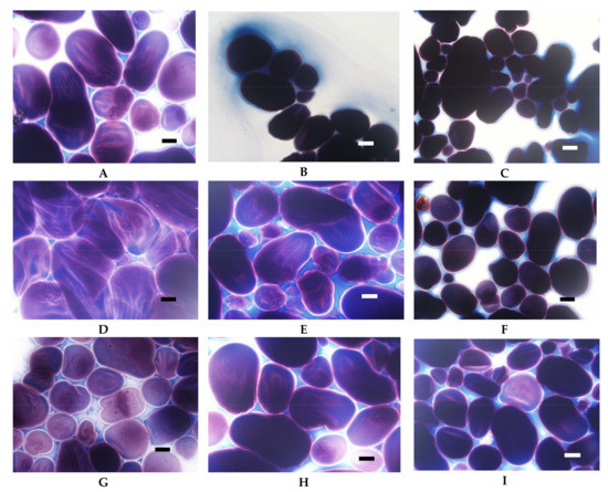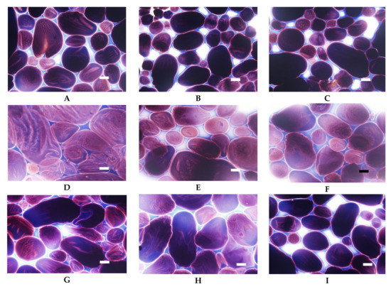 LM micrographs (20×) of distarch phosphates of potato origin with different degrees of crosslinking (L–low, M–medium, H-high) incubated in different conditions: (A) L, 90 °C, pH = 5.5; (B) M, 90 °C, pH = 5.5, (C) H, 90 °C pH = 5.5; (D) L, 123 °C, pH = 5.5; (E) M, 123 °C, pH = 5.5, (F) H, 123 °C, pH = 5.5; (G) L, 90 °C, pH = 3.5; (H) M, 90 °C, pH = 3.5, (I) H, 90 °C pH = 3.5 (Bar-20 µm).