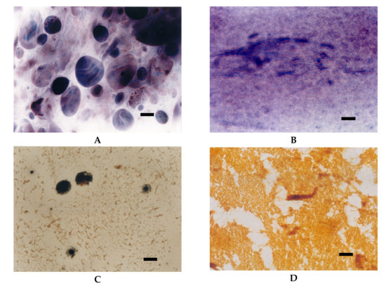 LM micrographs (20×) of potato cationic starches with different degrees of substitution incubated at different temperatures: (A) DS = 0.04, 60 °C; (B) DS = 0.04, 90°C; (C) DS = 0.13, 25 °C; (D) DS = 0.27, 25 °C (Bar-20µm).