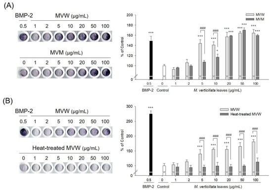 Effect of the extraction solvents (A) and heat treatments (B) on osteoblast differentiation of M. verticillata leaves. MVW: aqueous extracts of M. verticillata leaves; MVM: methanol extracts of M. verticillata leaves; BMP-2: bone morphogenetic protein-2. Significant differences were observed when compared with the controls: * p < 0.05, *** p < 0.001; significant differences were also observed between the two groups: ### p < 0.001.
