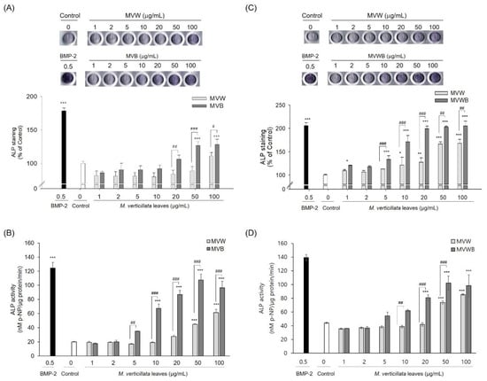 Effects of MVW, MVB, and MVWB on the alkaline phosphatase (ALP) activity of C3H10T1/2 cells. Visualization of the osteoblast differentiation of C3H10T1/2 cells by MVW and MVB (A) and MVW and MVWB (C). ALP activity of C3H10T1/2 cells by MVW and MVB (B) and MVW and MVWB (D). MVWB: the fermented MVW by B. subtilis MV1. Significant differences were observed when compared with the controls: * p < 0.05, ** p < 0.01, *** p < 0.001; significant differences between MVW and MVB or MVWB were observed: # p < 0.05, ## p < 0.01, ### p < 0.001.