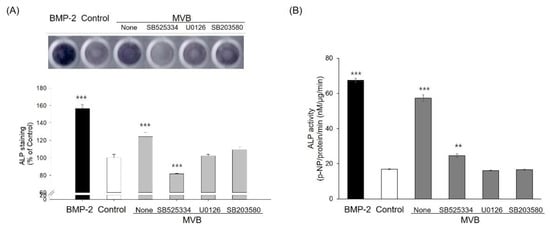 Effect of TGF-β signaling inhibitors on osteoblast differentiation. ALP staining (A) and ALP activity (B) of C3H10T1/2 cells by MVB and TGF-β signaling inhibitors. Significant differences were observed when compared with the controls: ** p < 0.01, *** p < 0.001.