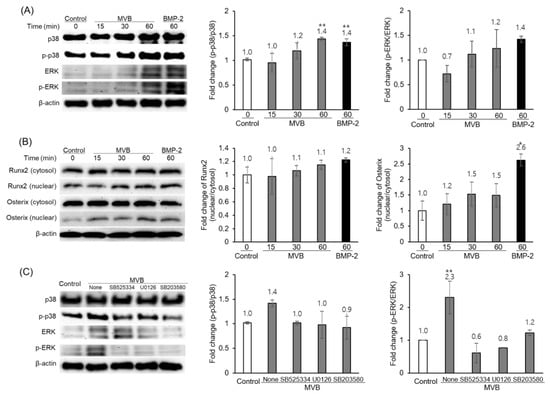 The western blot assay involved the following; C3H10T1/2 cells were cultured in 6 well plates for 2 days. The cells were treated with MVB during incubation. For inhibition of the extracellular signal-regulated kinase (ERK), p38, or the transforming growth factor-β (TGF-β) receptor, the cells were pretreated with 10 µM ERK inhibitor (U0126), p38 inhibitor (SB203580), TGF-β receptor inhibitor (SB525334), respectively, for 1 h followed by MVB treatment for 1 h [21]. The cells were rinsed with PBS three times, harvested, and lysed in radioimmunoprecipitation assay (RIPA) buffer. Protein lysate was separated by sodium dodecyl sulfate-polyacrylamide gel electrophoresis (SDS-PAGE) and then transferred to nitrocellulose membranes. The transfer membrane was blocked with 5% (w/v) BSA for 1 h and washed three times for 15 min with PBS supplemented with 0.1% Triton X-100 (PBST). The primary antibody against ERK (1: 200, Santa Cruz Biotechnology, Dallas, TX, USA), p-ERK (1:200, Santa Cruz Biotechnology), p38 (1:1000, Cell Signaling Technology, Danvers, MA, USA), p-p38 (1:1000, Cell Signaling Technology), and β-actin (1: 200, Santa Cruz Biotechnology) was added to the transfer membrane and incubated for 20 h and then washed with PBST. HRP-conjugated secondary antibody (1:2000, Sigma-Aldrich) was added to the transfer membrane and incubated for 1 h and washed with PBST. Then chemiluminescent reagents (Luminata Forte Western HRP substrate; Merck Millipore, Billerica, MA, USA) were added to the transfer membrane, and the bands were detected using a ChemiDocTM XRS+ imaging system (Biorad, Hercules, CA, USA).