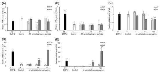 Murine C3H10T1/2 MSC line was purchased from the American Type Culture Collection (Rockville, MD, USA). C3H10T1/2 MSCs were cultured in MEM-α with 10% heat-inactivated FBS and 1% antibiotics (penicillin 10,000 U/mL and streptomycin 10,000 mg/mL) and maintained at 37 °C under 5% CO2 in a humidified culture chamber. For the cell viability assay, C3H10T1/2 cells (3 × 103 cells/well) were seeded into 96-well plates and cultured for 24 h. The cells were then treated with M. verticillata leaf extracts (MVW, MVB) at various concentrations ranging from 1 to 100 μg/mL and then cultured for 1–3 days. The media was replaced with fresh media (100 μL/well) containing 0.5 mg/mL MTT solution, and the cells were incubated at 37 °C for 1 h. The formazan crystals that were converted from MTT during the reaction of oxidoreductase in the living cells, were dissolved in 100 μL of DMSO, and their absorbance was measured at 570 nm using a microplate reader.