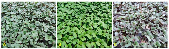 Genotypes used for producing microgreens: (A) broccoli, cultivar ‘Broccolo natalino’; (B) broccoli raab, local variety ‘Cima di rapa novantina’; (C) cauliflower, cultivar ‘Cavolfiore violetto’.