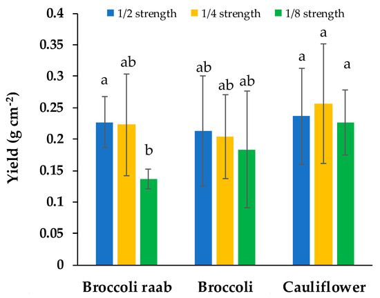 Yield of three genotypes of microgreens grown with three NS strengths: 1/2 strength, 1/4 strength and 1/8 strength (first experiment). Different letters indicate that mean values are significantly different, according to the SNK test (p = 0.05). Vertical bars represent ± standard deviation of mean values.