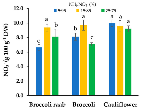 Broccoli raab had the lowest and highest nitrate content with the molar ratio NH4:NO3 5:95 and 15:85, respectively, while broccoli showed the lowest and highest nitrate content with NH4:NO3 25:75 and 15:85, respectively. No differences were found in nitrate content in cauliflower by using different NH4:NO3 ratios (Figure 3).