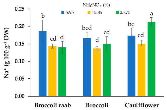 Cauliflower grown using a NS with a NH4:NO3 25:75 molar ratio showed the highest sodium content, which was 31% higher than the two other molar ratios used for the same genotype (Figure 4). Broccoli raab grown by using a NS with a NH4:NO3 5:95 molar ratio showed a sodium content 36% higher than the other molar ratios of the same genotype. The average sodium content in broccoli was 0.15 g 100−1 DW, without differences between NH4:NO3 molar ratios (Figure 4).