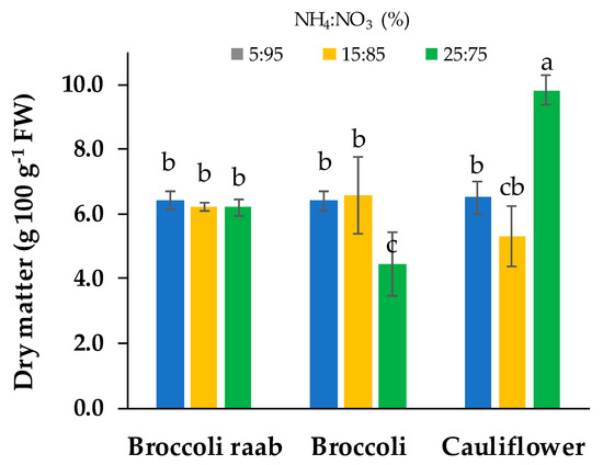 The highest value of dry matter was obtained from cauliflower grown with a NH4:NO3 25:75 molar ratio that resulted in 66% higher content than the two other molar ratios of the same genotype (Figure 4). Broccoli showed a dry matter content 31% lower with a NH4:NO3 25:75 molar ratio compared to other molar ratios. The average content of dry matter in broccoli raab was 6.3 g 100−1 FW, without differences between NH4:NO3 molar ratios (Figure 5).