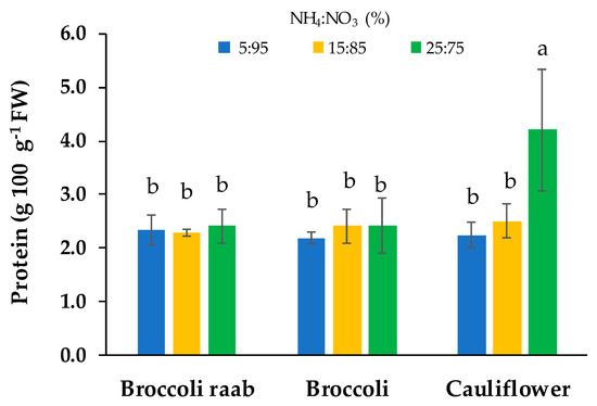 As for protein content, cauliflower grown with a NH4:NO3 25:75 molar ratio gave the highest value, which resulted in 79% higher content than the other nutrient solutions (Figure 6).