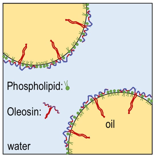 Rapeseed has a complex protein composition including both the storage proteins cruciferin and napin and oil body proteins such as oleosin and caleosin. Cruciferin and napin (11S globulin and 2S albumin) comprise 60% and 20%, respectively, of the total proteins in mature seeds, and oil body proteins accounts for the rest. Cruciferin has a molecular weight of 230–300 kDa and is composed of six sub-units each containing one acidic 30 kDa alpha chain and one basic 20 kDa beta chain which are linked by a disulfide bond [17]. Napin is a strongly basic protein with a molecular weight of 12–17 kDa [18] and is composed of a 4.5 kDa chain and a 9.5 kDa chain stabilized by disulfide bonds and disulfide bridges. The literature is reporting conflicting data on the isoelectric point (PI) of cruciferin and napin, but most commonly reported are PI 7.2 for cruciferin and PI of around 11 for napin [11]. The oil in rapeseeds is contained within oil bodies that are discrete intracellular structures consisting of an oil core, stabilized by a phospholipid monolayer embedded with proteins, of which 80–90% is oleosin [19] (Figure 1). The biological functions of oleosin are to prevent coalescence of the oil bodies within the seeds during periods of drought. Oleosins are 15–26 kDa in size, but generally not exceeding 18 kDa [8,20]. The protein structure of oleosin is the foundation of its function—both as a structural protein within the seed and as a potential emulsifier. Oleosin has three structural domains that assume a distinctive configuration at the oil-water interface: an amphipathic domain and the N-terminal (30 to 60 amino acid residues), a central hydrophobic domain (72 residues), and an amphipathic domain at the C-terminal (60 to 100 residues) [19]. The central hydrophobic domain is special with respect to the number of consecutive hydrophobic amino acid residues. In comparison to other emulsifying proteins (i.e., from dairy and eggs), oleosin has a somewhat large overall size, but a very large purely hydrophobic domain that allows strong adsorption at the oil-water interface (Figure 1) while the two amphipathic ends, together with phospholipids, create a compact interfacial layer. Taken together, the structural elements of oleosin can contribute to both physical and chemical stability in emulsions stabilized by them [21].