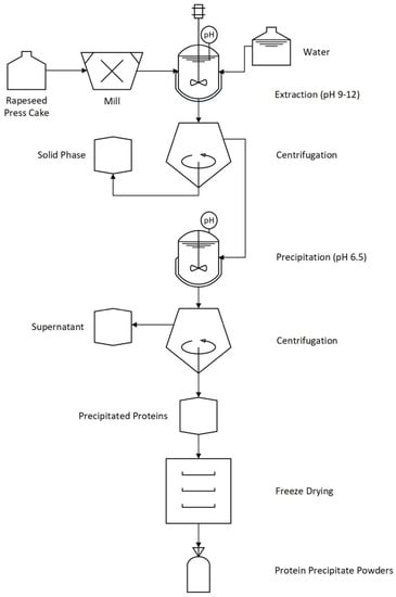 - Fetzer, A.; Herfellner, T.; Stäbler, A.; Menner, M.; Eisner, P. Influence of process conditions during aqueous protein extraction upon yield from pre-pressed and cold-pressed press cake. Ind. Crop. Prod. 2018, 112, 236–246. [Google Scholar] [CrossRef]