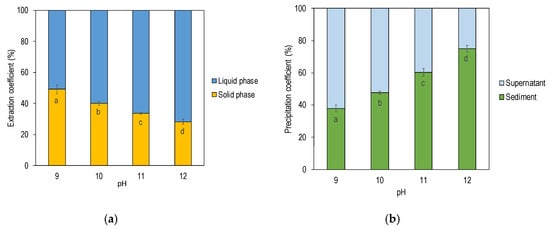 (a) Extraction coefficient displaying how rapeseed protein is distributed in the liquid phase and solid phase respectively after alkali extraction and separation. (b) Precipitation coefficient displaying how rapeseed protein is distributed after precipitation and separation. Data is an average of three extractions at each pH value. Different letters within each figure indicate significant difference p < 0.05.
