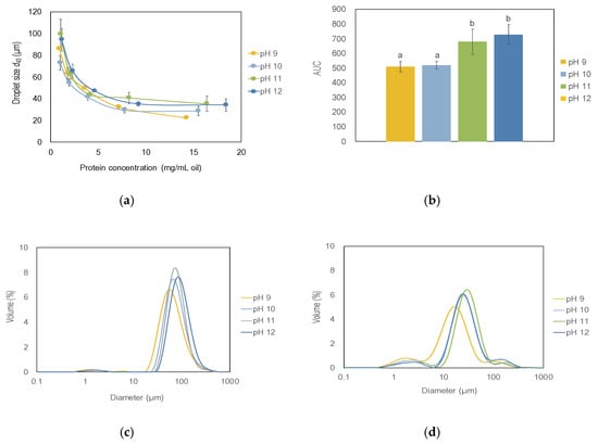 (a) Emulsion droplet size (d43) as a function of protein concentration in emulsions stabilized by rapeseed protein extracted at different pHs. Emulsions were 30% oil-in-water emulsions produced by high shear homogenization. (b) Area under the curve for droplet size d43. Different letters indicate significant differences, p < 0.05. (c) Size distributions of emulsions stabilized by rapeseed protein extracted at different alkali pH values. Protein concentrations in the emulsions were 0.9–1.1 mg/mL oil. (d) Size distributions of emulsions stabilized by rapeseed protein extracted at different alkali pH values. Protein concentrations in the emulsions were 14–18 mg/mL oil. Data is an average from six measurements of two extractions at each pH value.