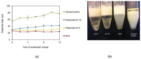The particle size distribution of emulsions stabilized by freeze-dried rapeseed protein precipitates, BSA, and de-oiled lecithin was monitored under accelerated storage conditions (30 °C) for 12 days. There was a trend towards an increased mean droplet size which was significant for the de-oiled lecithin stabilized emulsion (Figure 5a). All emulsions exhibited creaming due to the relatively large size of the emulsion droplets (20–40 µm) produced at 8 mg/mL oil, but this did not result in coalescence or oiling off, with the exception of de-oiled lecithin which increased in droplet size by 40% over 12 days, and a layer of free oil was clearly visible (Figure 5b). Rapeseed proteins extracted at pH 9 stabilized smaller emulsion droplets during the 12 days stability test compared to proteins extracted at pH 12. These results were indicated already in the miglyol emulsion model (Figure 4a) but could be confirmed also in a fish oil emulsion system (Figure 5a), and the difference between the two rapeseed protein samples sustained also over a longer time.