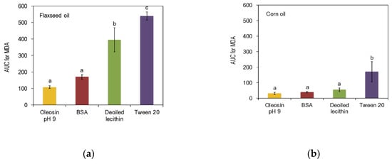 Oxidative stability for (a) flaxseed oil emulsions (b) corn oil emulsions stabilized by rapeseed protein extracted at pH 9, bovine serum albumin (BSA), de-oiled lecithin and Tween 20 expressed as AUC for malondialdehyde (MDA) concentrations (mg MDA/L emulsions). Data is an average of four measurements of two emulsion replicates for each oil. Different letters indicate significant differences within each figure, p < 0.05.