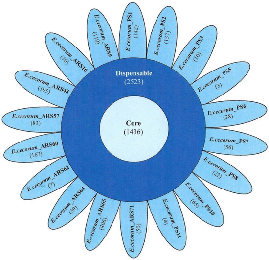The pan-genome analysis for the E. cecorum isolates was initiated with 41,650 protein-coding sequences that resulted in 5493 gene families. The core gene set comprised 1436 genes, i.e., 62% of the average number of protein-coding sequences (2314 per genome), suggesting that more than half of the protein-coding sequences were part of the core and just over 1/3 of the protein-coding sequences in each genome were dispensable. The number of core, accessory, and unique genes in each genome is represented as a floral diagram in which the inner circle, outer circle, and petals represent core, accessory, and unique genes, respectively (Figure 1). The unique genes present in clinical isolates ranged from 3–142, whereas those in non-clinical isolates ranged from 7–406.